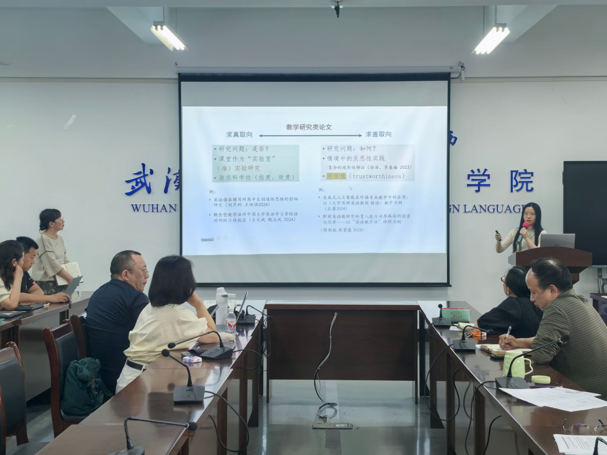 谭燕保以“AI时代外语学科的成长性”为题,开启了本次论坛。她的报告分为三个部分:AI时代的成长条件、“我”的成长意识及“我们”的成长方向。在谈到AI时代的成长条件时,谭燕保提出问题:“外语学科往何处去?”围绕该问题,她进行了分析,指出当今时代是需要外语的,高水平对外开放、国际话语、国际组织等方面对外语人才是有需求的,并提出外语老师利用AI时要在“大用”中寻求“实用”;她还引用了北京语言大学王立非教授的坚持外语学科“四个自信”不动摇:专业道路自信、专业理论自信、专业价值自信、专业人才自信,以此鼓励老师们要不断发展自己。在谈到“我”的成长意识时,谭燕保带领老师们回顾了学院近几年的发展及取得的成就,并引用4月12日学院学科专业及课程思政示范课程建设论证会上北京外国语大学孙有中教授的发言,指出AI 时代的武汉纺织大学外国语学院要“做特”“做新”“聚焦”,展示外国语学院的表现力和贡献度。在谈到“我们”的成长方向时,谭燕保提出两个问题让老师们思考:我们被需要吗?我们能做到吗?随后她和老师们一起讨论问题的答案,并鼓励老师们跟随学院发展的方向,体现自己的贡献度,在AI+学科时代培养兼具技术敏感性与人文批判力的复合型人才。