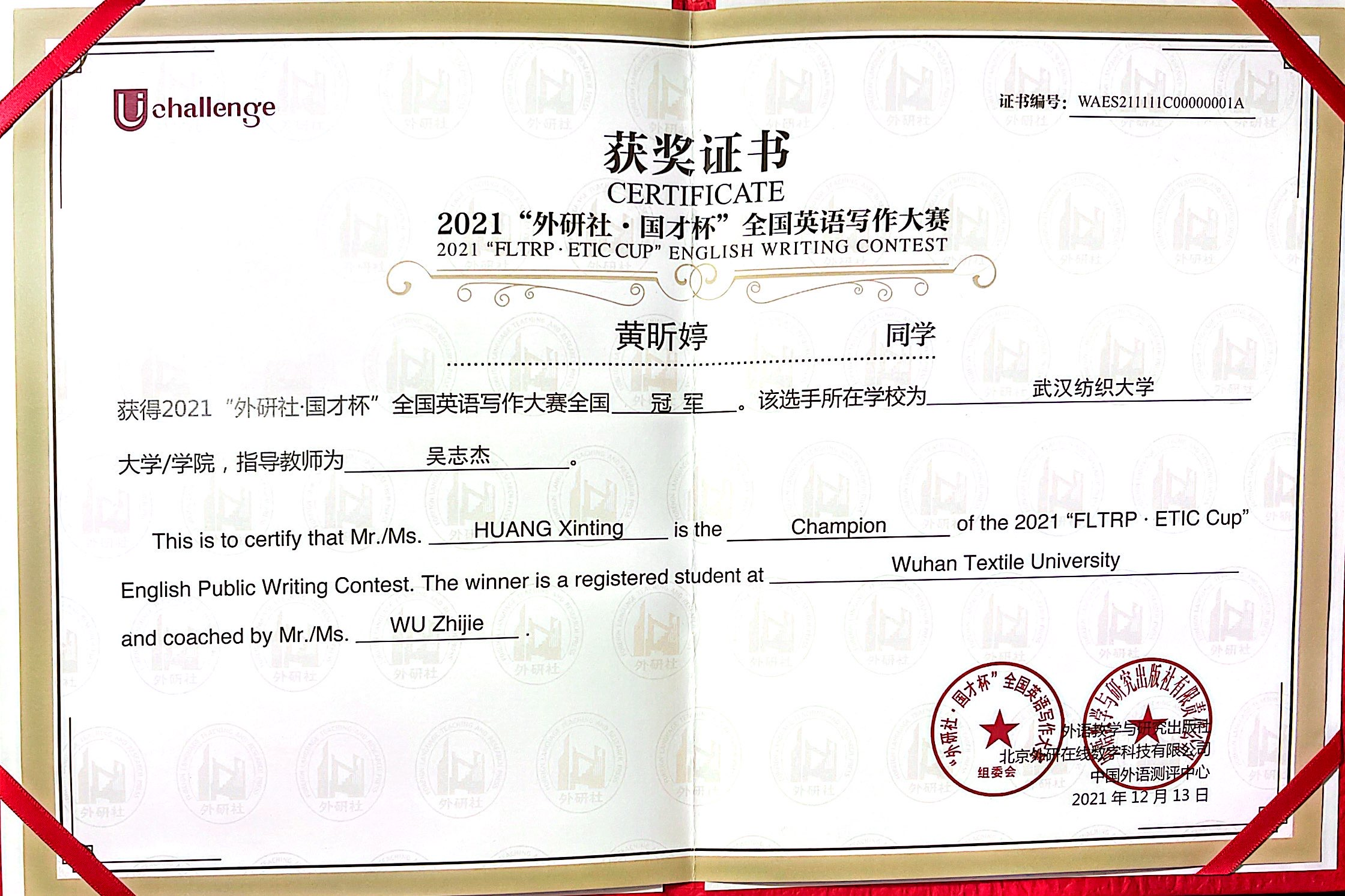 一分耕耘一分收获。黄昕婷在外研社杯·全国大学生英语挑战赛湖北省赛中一举获得特等奖。此后,在强手如林的全国赛中,她又获得国家二等奖。