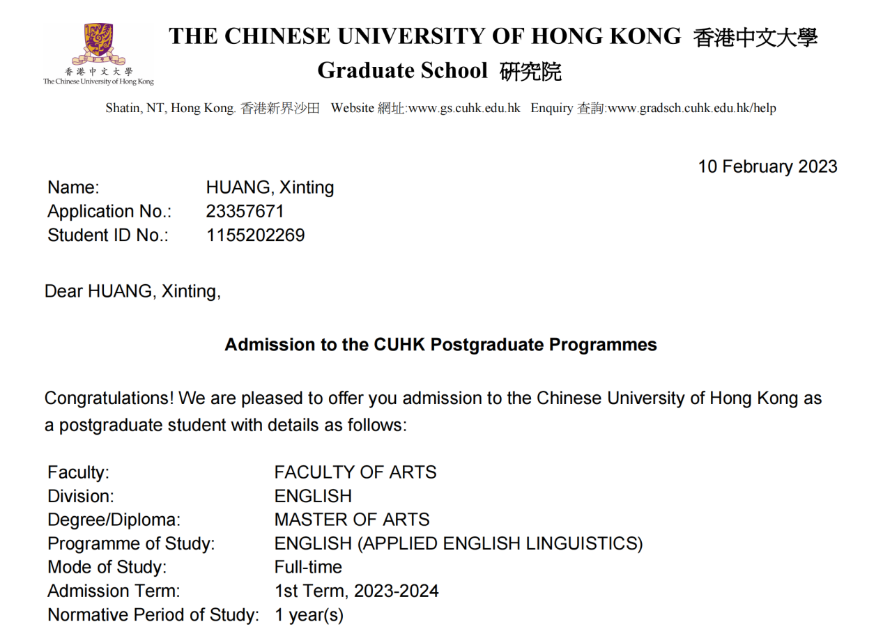 凭借实力,今年1月6日,香港中文大学通知她获得面试机会,六天后面试。面试结束第二天,她收到推研信。一个月后,她如愿收到香港中文大学硕士的正式录取通知书,攻读应用语言学专业。