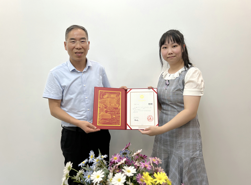 外国语学院院长谭燕保教授将一套《京华烟云(中英文版)》赠送给余欣桐,谭燕保说,今天是个特殊日子,你拿到的这份“纺大红”新版录取通知书,意味着从今天开始,你正式成为纺大外国语学院大家庭中的一员了,从此,我们一起读原著、读经典,一起感受语言学科的魅力和乐趣,一起讲述新时代美好纺大故事。希望你要知感恩,爱学习,懂生活,在纺大收获成长的幸福。