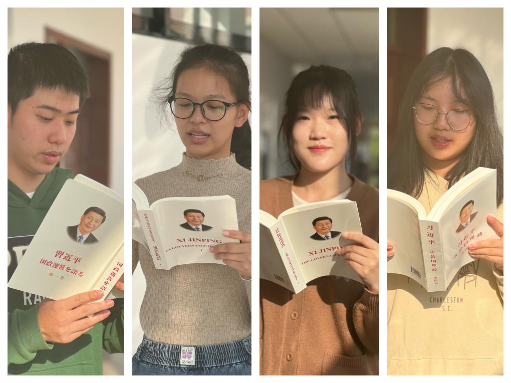 随后,新生代表、研究生代表、社团代表、本科生代表4名同学分别用中、英、日、法四种语言朗读《习近平谈治国理政》中的部分章节内容,并分享了自己的读书心得。英语12202班徐潘若宸作为新生代表,用中文朗读了“发扬北京冬奥精神,加快建设体育强国”篇章内容,并强调冬奥、冬残奥会不仅是一项体育赛事,更弘扬了中华文化,传递了友谊,振奋了民族精神。研2220级彭怡然用英文朗读了“实现中国梦不仅造福中国人民,而且造福世界人民”篇章内容,她结合实际谈到中国梦并不是一个口号,而植根于每个中华儿女的心中。日语角社团代表方泓喆分享交流了坚持中国特色社会主义发展的相关内容,他通过中日两种语言的对比学习,加深了对文章的理解,在翻译中,他明白翻译容易,但内涵丰富。英语12001班曾钰璇用法语朗读了“与邻国外交之共建丝绸之路”篇章内容,分享了中国外交故事和外交智慧。