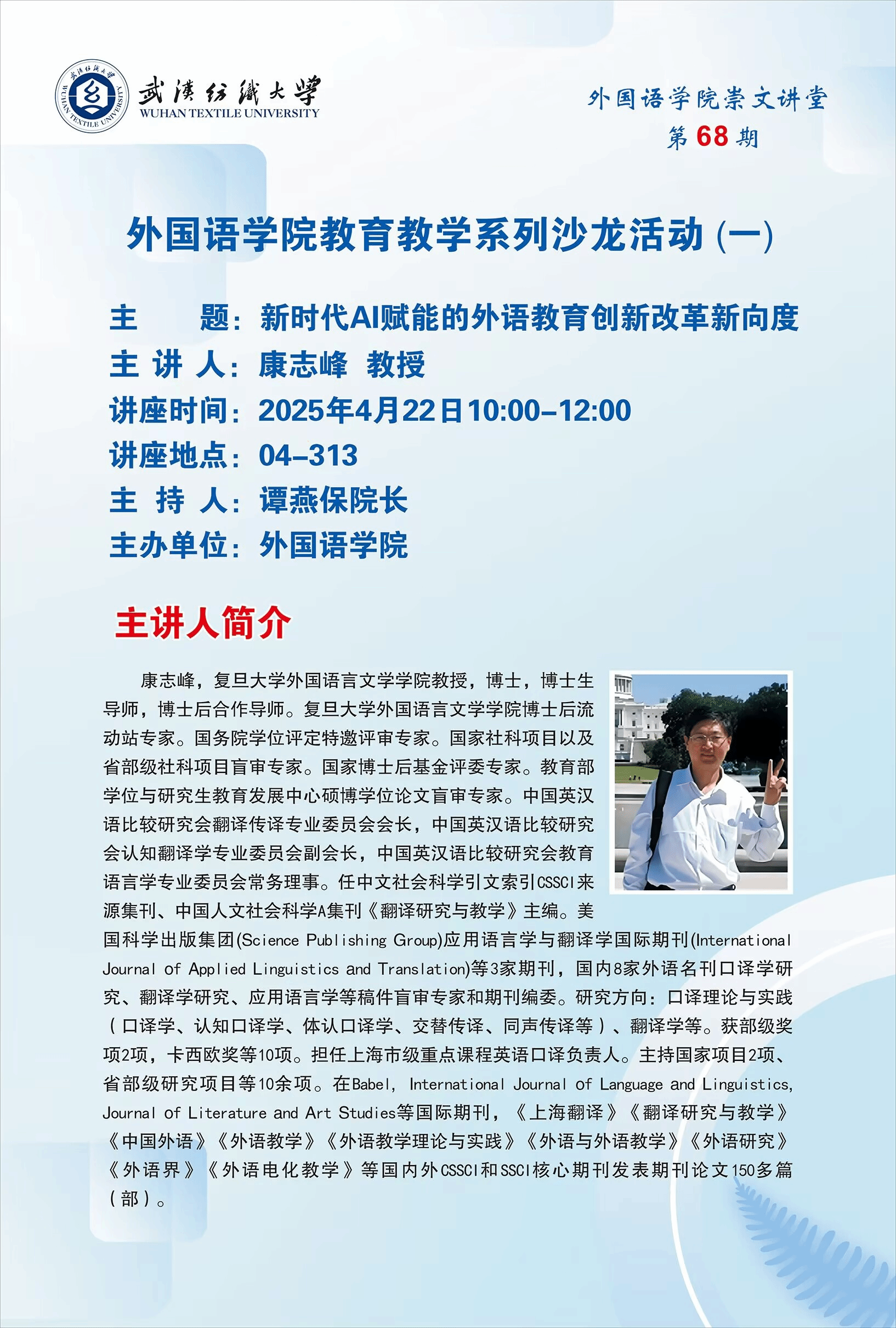 4月22日下午,外国语学院特邀复旦大学外国语言文学学院康志峰教授为学院师生在崇文楼313举办主题为《新时代AI赋能的外语教育创新改革新向度》的讲座。科发院院长吕永钢教授和外国语学院师生一同参加讲座。讲座由外国语学院院长谭燕保教授主持。