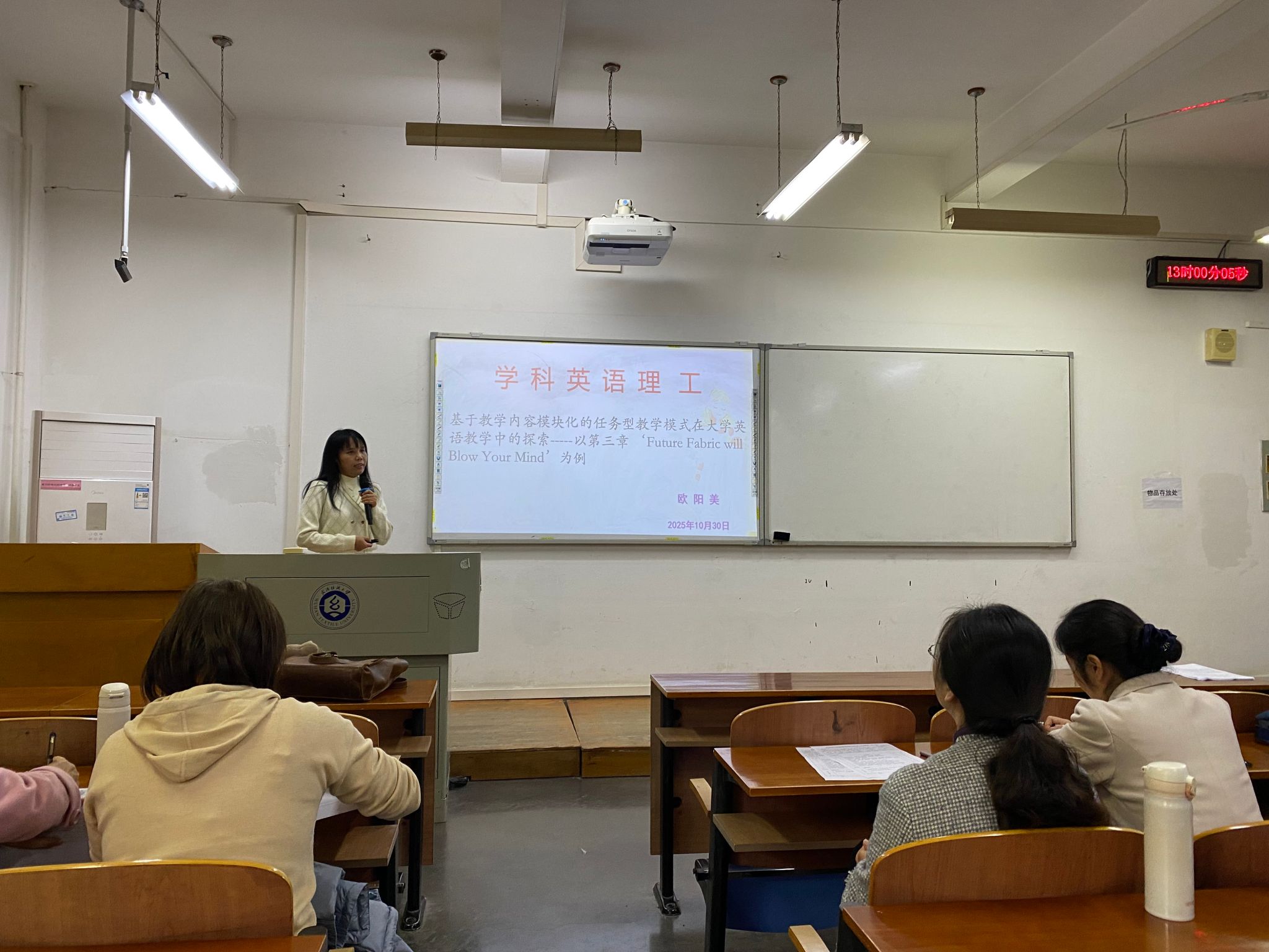 欧阳美老师以《学科英语(理工)》第三单元 “Future Fabric will Blow Your Mind”(未来面料将颠覆认知)为核心案例,系统阐述了 “基于教学内容模块化的任务型教学模式” 的设计逻辑与实践路径。她指出,该模式以 “教学内容模块化” 为前提,以学生为主体,以具体任务为学习动力,将任务完成过程转化为学习过程,最终通过任务成果展示检验教学成效,有效衔接理工学科知识与英语语言能力培养。欧阳美老师强调,理工学科英语教学需打破 “语言学习与学科知识割裂” 的传统模式,通过模块化任务设计,实现学生英语语言技能与理工学科素养的双重提升。