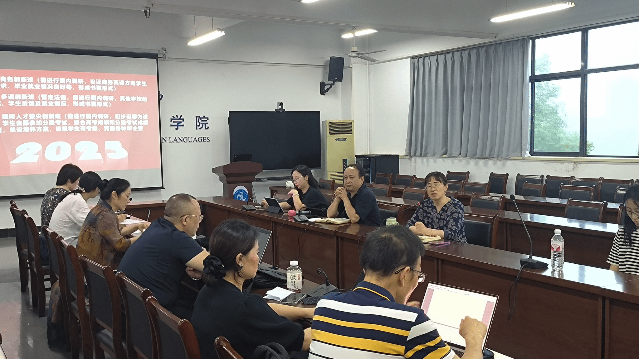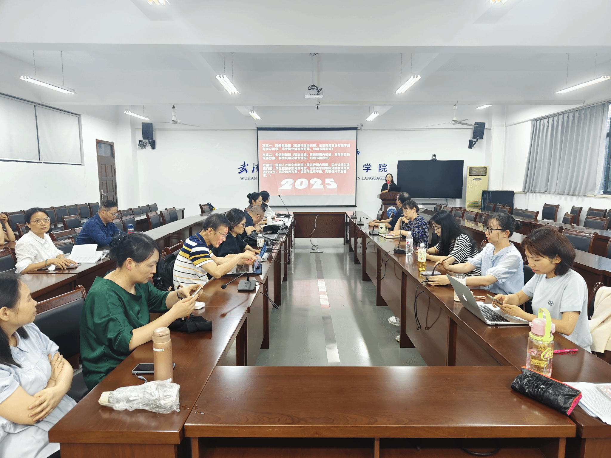 会议首先讨论了英语专业扩招背景下特色办学路径。袁哲老师首先汇报了近期对江汉大学、襄阳文理学院等高校的调研结果。江汉大学法语辅修项目通过三年紧凑的文学、语言学等法语课程设置,使学生达到法语四级水平,不仅为考研提供二外优势,还凸显了专业学生的多语优势;华中农业大学、襄阳学院等校的创新班模式也为我院提供了参考。黎健老师结合商务英语专业应用性强的特点,建议开设“商务创新班”,强调培养学生跨领域实践能力以应对多元就业需求。