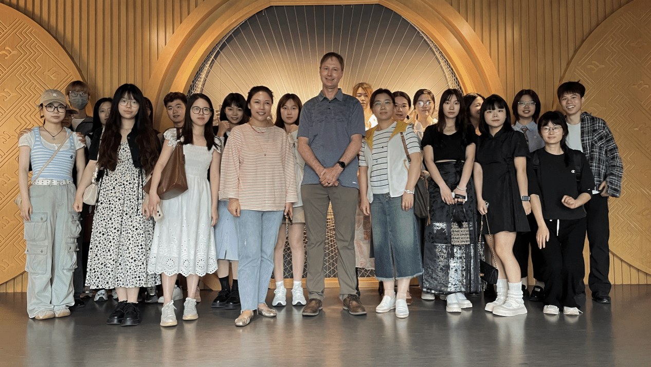 5月7日世界著名科学家来鄂讲学计划专家美国爱达荷州立大学的语言学家Prof. Brent Wolter与外国语学院MTI研究生一道赴我校荆楚纺织非遗馆开展交流。外国语学院研究生导师郑亚娟,服装学院郎丽老师参与交流。