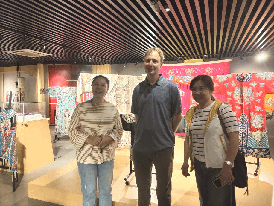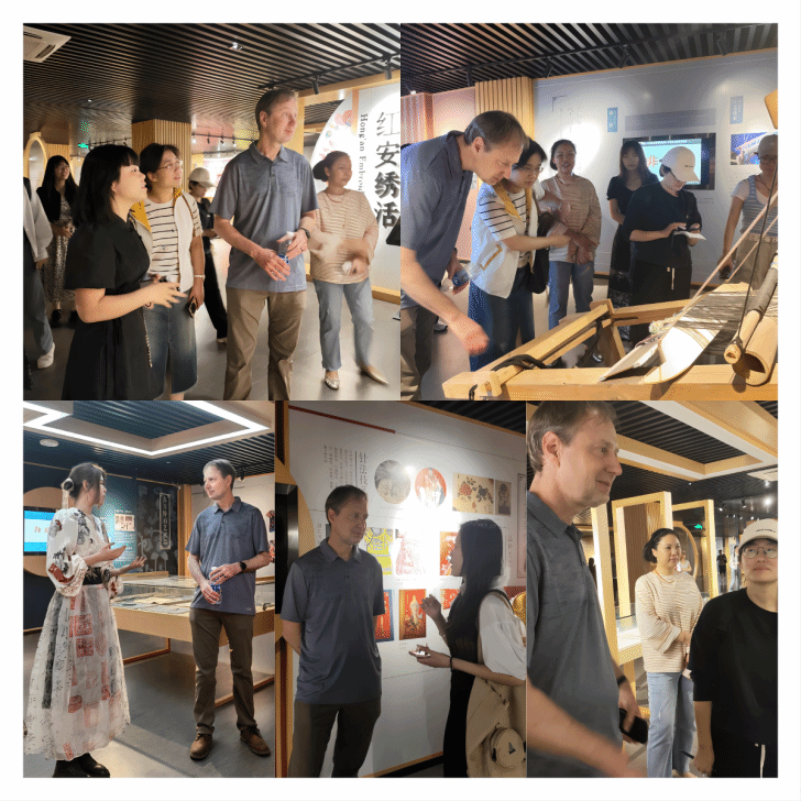 Wolter教授在同学们的介绍中领略了中国的传统刺绣、纺织、服饰等非遗文化,领悟了汉服、马面裙等中国古代服饰文化内涵,感受了古代服饰与戏剧文化的融合,欣赏了黄梅挑花、红安绣活、英山缠花等中国特色的民间手工艺及非遗展示作品,深刻感受到了中国传统文化的深厚底蕴和文化内涵。他表示,这趟看非遗之旅非常“Amazing and Worth Going”。这是他第一次近距离感受到如此灿烂的中国非物质文化遗产,对我校和同学们的介绍表示赞赏和感谢。