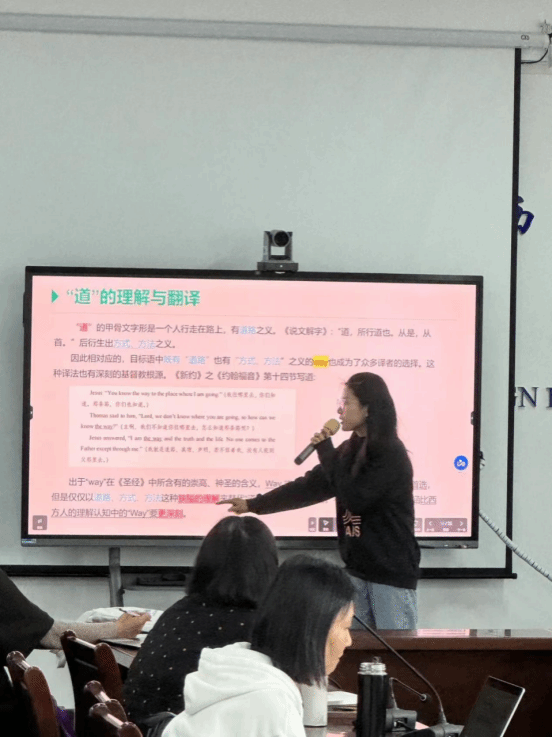 第四位汇报人为张敏。她分享的主题是“《道德经》核心概念英译的对比研究”。她首先介绍《道德经》英译本的概况以及对外传播。其次,对比分析理雅各和韦利译本对“道”和“名”的翻译方法。最后,对典籍外译进行了总结思考:第一,翻译的底本和注本需选用权威版本,并积极参考各种古籍文献,确保深入理解原文。第二,翻译人员需具备对外国文学和中国传统文化的深厚理解,以确保典籍原文信息的准确传达。第三, 在翻译过程中要尊重原作,同时避免译文谬误,误导读者。第四, 在直译与意译之间要取得平衡,确保译文准确、生动、清晰,成为一件艺术品。