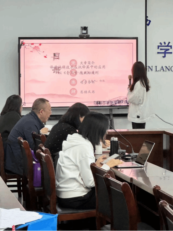 第三位汇报人为向敏。她以辛弃疾的《青玉案·元夕》为例,对比机译(deepl和Chatgpt)和许渊冲译文的差异,详细阐述了在变译理论指导下,采用增、述、并等变译方法对文本进行译前编辑,提高了机器输出的翻译质量,并通过译前编辑,减少了错误,提高了可读性。
