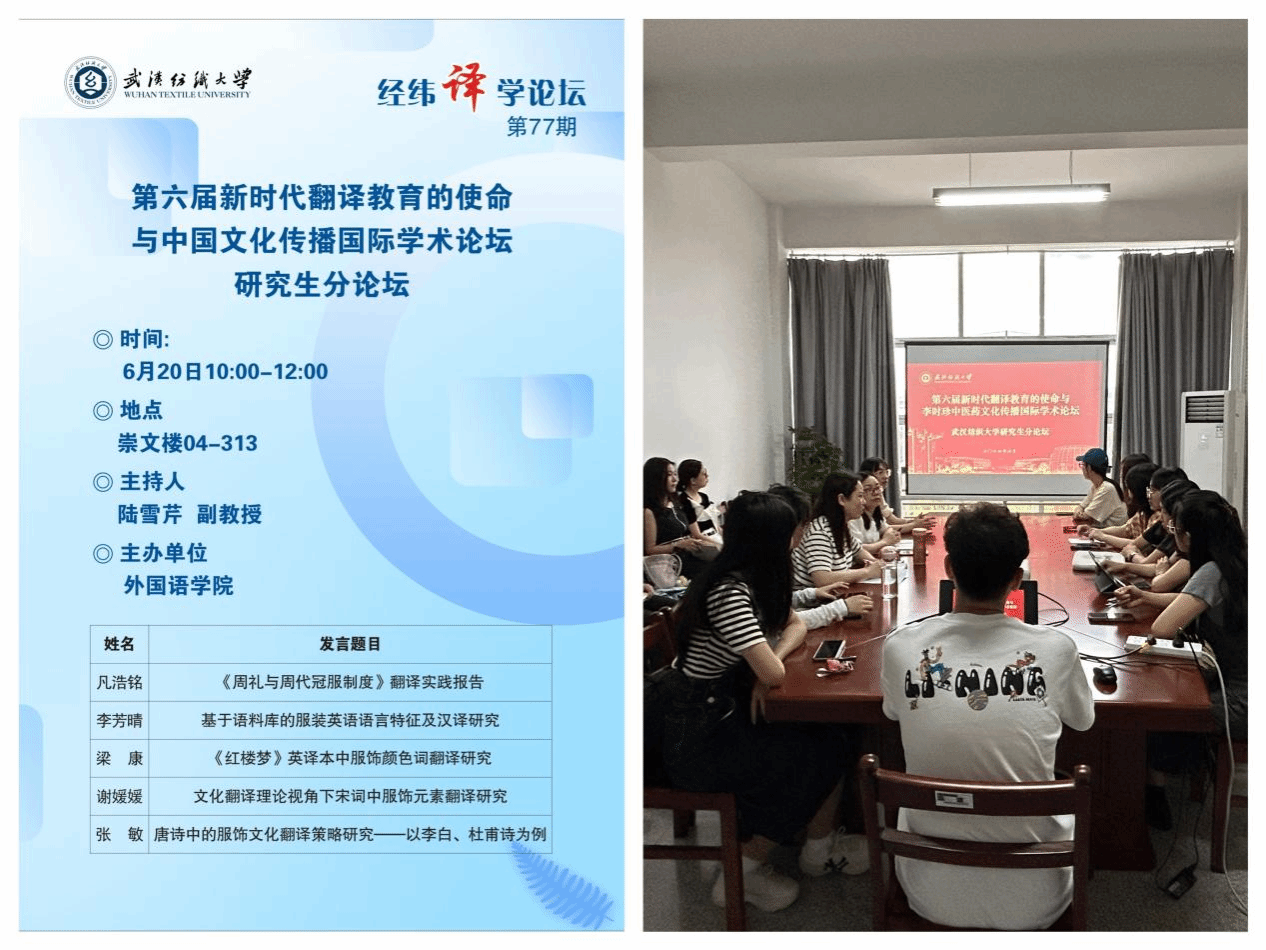 第五位汇报人张敏分享的主题为《唐诗中的服饰文化翻译策略研究——以李白、杜甫诗为例》,提出关注文化内涵的传递当适当进行文化背景的介绍和补充,灵活运用翻译方法和技巧能保证译文的可读性和欣赏性,这样可使唐诗中的服饰文化在翻译作品中焕发新的生机和魅力。
