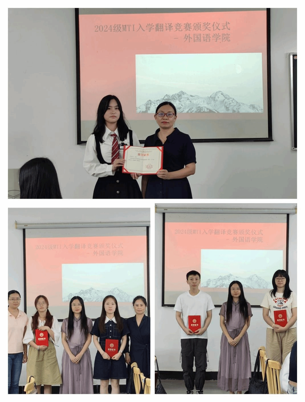 经过紧张激烈的角逐,一批表现优异的同学脱颖而出。张璐莹都六名同学、孙康等六名同学分获MTI翻译竞赛、MTI入学读书报告会比赛一、二、三等奖。外国语学院副院长刘方荣及导师代表吴志杰、张守慧为获奖同学颁发证书及奖品,并对他们的努力和成绩给予了高度评价。