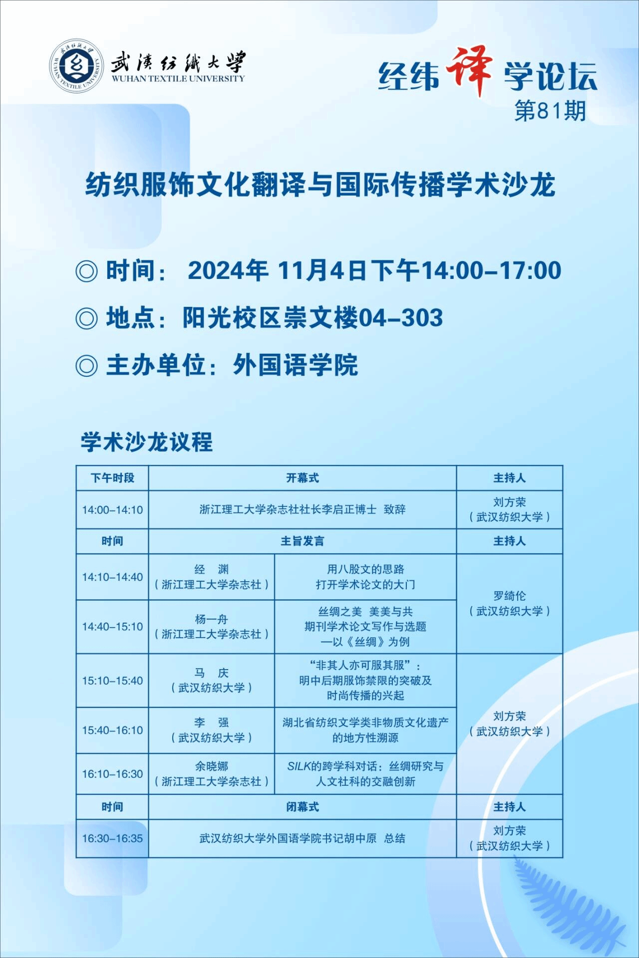 11月4日下午,外国语学院举办了以“纺织服饰文化翻译与国际传播”为主题的学术沙龙。本次沙龙特别邀请浙江理工大学杂志社副社长经渊、学术期刊《丝绸》副主编杨一舟、SILK编辑余晓娜,以及我校传媒学院副院长马庆、期刊社副编审李强作主旨发言。22级、23级及24级MTI研究生参加了此次沙龙。活动由外国语学院副院长罗绮伦和刘方荣主持。
