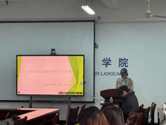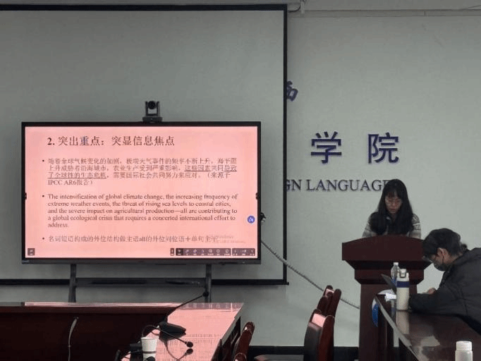 第一位汇报人樊新钰的主题为《党政文献翻译中的守正与创新》,分为三个部分,层层递进,条理清晰。她首先从重要思想和核心理念的翻译开始,将报告进行对比,然后结合具体翻译实例,指出了报告翻译中的创新之处。同学们从中学习了党政文献翻译策略和翻译技巧。