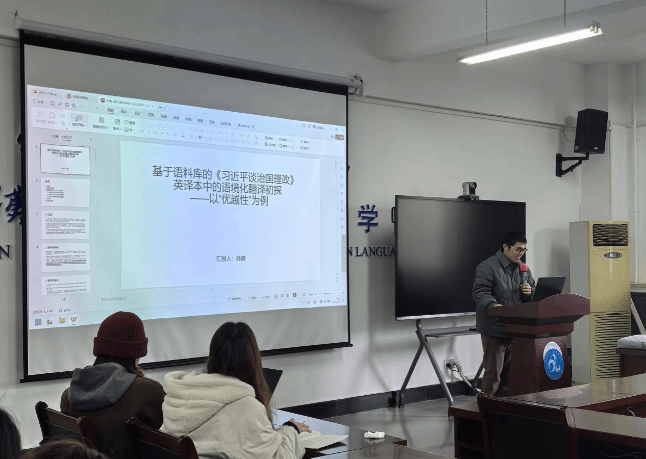 第二位汇报人孙康的主题是“基于语料库的《习近平谈治国理政》英译本中的语境化翻译初探—以‘优越性’为例”的研究报告。汇报人分析了作者、译者和读者三元关系在翻译中的互动。通过语料库分析,发现“优越性”在英译本中有多种表达,如“superiority”“strength”“advantage”和“worth”。最后,孙康同学强调了翻译中需要考虑读者接受度,并指出语境化翻译理论对外宣翻译实践的理论指导价值。