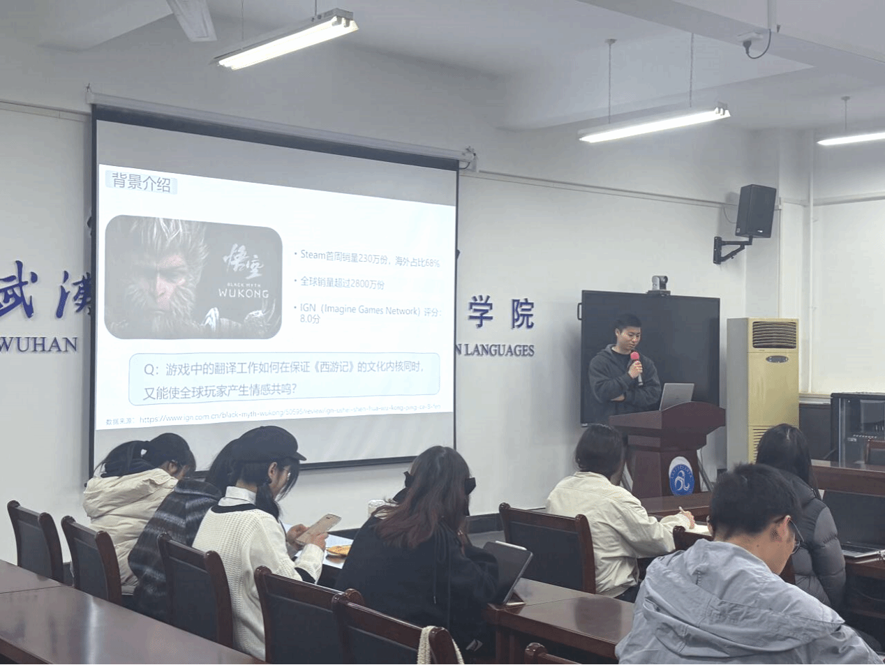 第一位汇报人金国丰的主题为“功能对等视角下《黑神话:悟空》中文化负载词的翻译策略”。金国丰同学聚焦于游戏《黑神话:悟空》中文化负载词的翻译,以游戏取得的成绩为背景,结合奈达的功能对等理论,深入剖析。他认为,在游戏翻译方面,多模态创新能够补偿文化损耗,归化策略可以提升玩家理解度。然而,翻译仍然存在文化主体性让渡、隐喻系统断裂、玩家忽视文本翻译等问题。《黑神话:悟空》在文化负载词翻译上有成果也有不足,未能很好平衡文化传递与玩家接受度。为此他提出建立分级译文系统,包括以归化为主的基础版、异化加悬浮注释的进阶版、直译加术语索引的硬核版,满足不同玩家需求。在保证游戏流畅性的同时,最大程度保留文化内涵,避免过度简化或丢失文化元素,促进《西游记》文化在全球的有效传播。