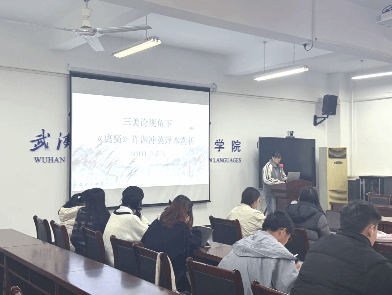 第二位汇报人卢嘉怡的主题为“三美论视角下《离骚》许渊冲英译本赏析”。卢嘉怡同学以“三美论”为视角,从意美、音美、形美三个维度剖析译本特点,并结合名家评价与个人观点进行综合评估,最后总结了诗歌英译的要点。她认为,该译本的优点在于注重节奏韵律、语言简洁,兼顾信息、韵律和形式;缺点是有时为追求音律和形式对仗,会牺牲部分语义精准度。卢嘉怡同学总结到,许渊冲《离骚》英译本借助“三美论”和翻译策略,保留了原诗意境情感,但仍然存在不足。诗歌英译应保留文化内涵,灵活运用策略,兼顾内容与形式美,并推动中国诗歌文化的跨文化传播。