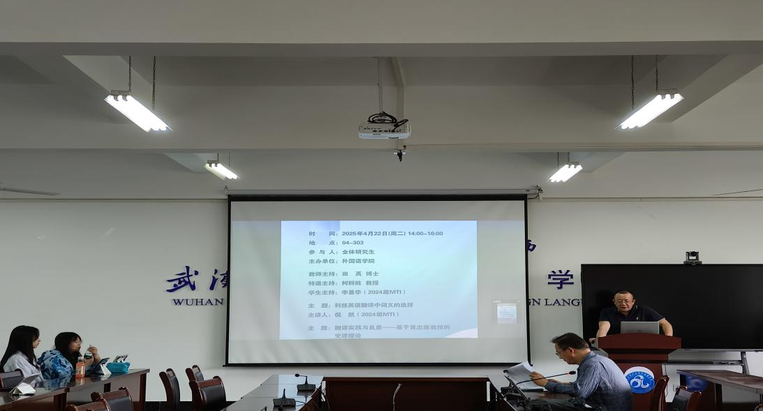 4月22日,外国语学院在崇文楼303教室举办了第九十三期“经纬译学”研究生论坛。柯群胜教授和田禹博士分别作为特邀点评嘉宾和教师主持,24级MTI研究生李曼华担任学生主持。倪然、黄赢纪、吴传琦三位24级MTI研究生在论坛上进行了分享。