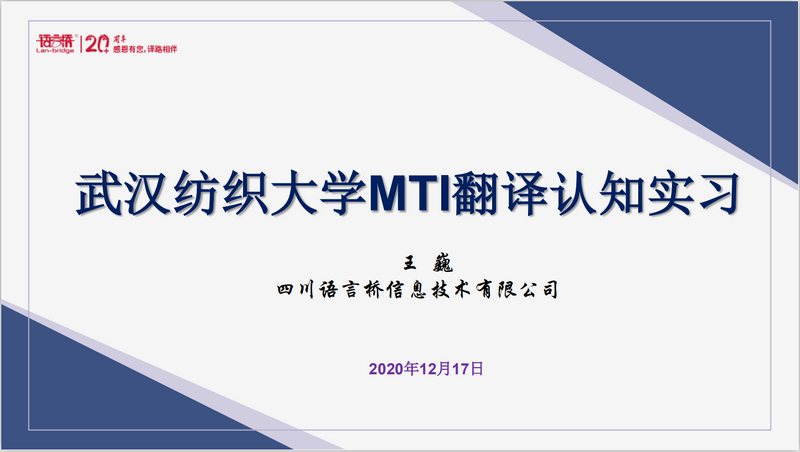 为了帮助MTI新生尽快熟悉专业翻译公司的运行环境及项目翻译流程与要求,12月17日下午,学院特邀我院企业导师四川语言桥信息技术有限公司副总裁王巍女士为我院20级MTI研究生做了一次线上翻译认知实习。本次活动由外国语学院MTI教育中心副主任华敏副教授主持,全体20级MTI研究生参加。
