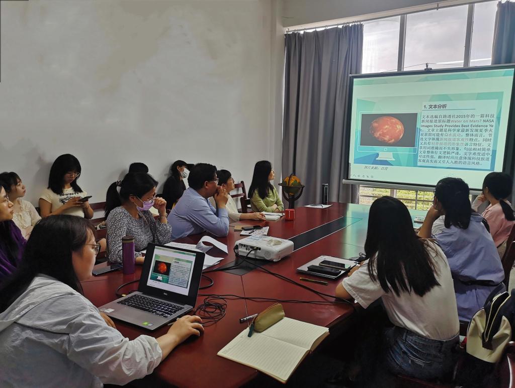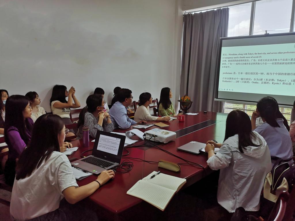 2021年5月31日下午,外国语学院在学院313会议室成功举办第十三期“经纬译学”研究生学术沙龙。本次沙龙由刘珊副教授主持,20级MTI研究生顿新琪、赵江平主讲。外国语学院院长谭燕保教授,MTI教育中心陈奇敏副教授、赵伟副教授,王辞老师及全体20级MTI研究生参加了此次研讨会。