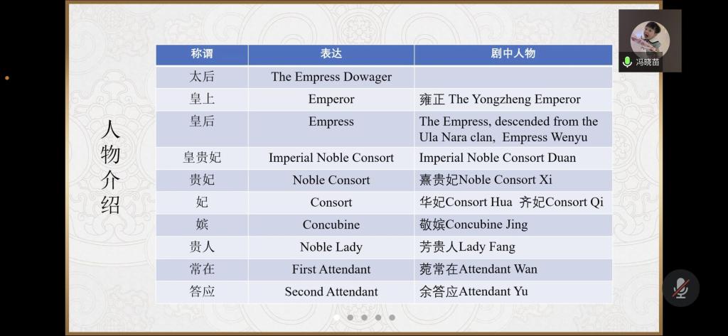 冯晓苗同学以“《甄嬛传》美版台词翻译”为主题,整理了美版《甄嬛传》中关于中国传统文化中称谓、地名、官阶和诗词句等的翻译方法。例如,遇到人物称谓时,要根据历史史实具体分析,灵活变换译法;诗词要按照英文韵律寻找对应的词句借代物,使中文诗词的翻译既能表达出来又能被目的语读者所接受。
