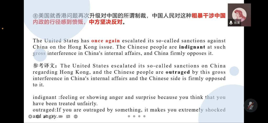 陈菁同学以“中美高层战略对话翻译分析”为主题,就中美外交部记者招待会上的发言进行分享与反思。她对中美外交发言的语言特色进行了梳理,从整体上把握了翻译中的用词和整体句意的传达,并提出了有关俚语的翻译问题,比如汉语表达中常常会采用一些俗语的表达,而在翻译过程中会忽视俚语背后想要表达的真实意思,就应选择更加准确的表达方式。