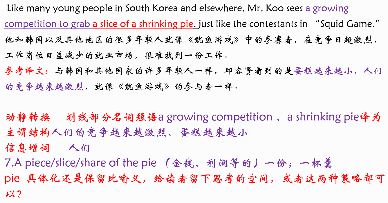 熊孟兰同学分享的主题是“外刊翻译分享”,主题是近期大热的网剧《鱿鱼游戏》,对自己的译文进行了评析的同时将原文中不太常见的词句的用法做了详细讲解,并且将每一处翻译方法都择出进行分析。其中针对文中使用的暗喻手法表达,熊孟兰同学提出了自己的疑问,同学们也展开了讨论,最后大家一致认同:意译与直译的策略还应与具体的语境相结合来进行选择。左灿同学提出了如何将原文中的3800万美元译为456亿韩元的问题,联系前文发现该网剧是韩国背景且参与游戏的人数恰为456人,游戏奖励是每人1亿元。翻译过程中,对于原文主题的了解是非常重要的。