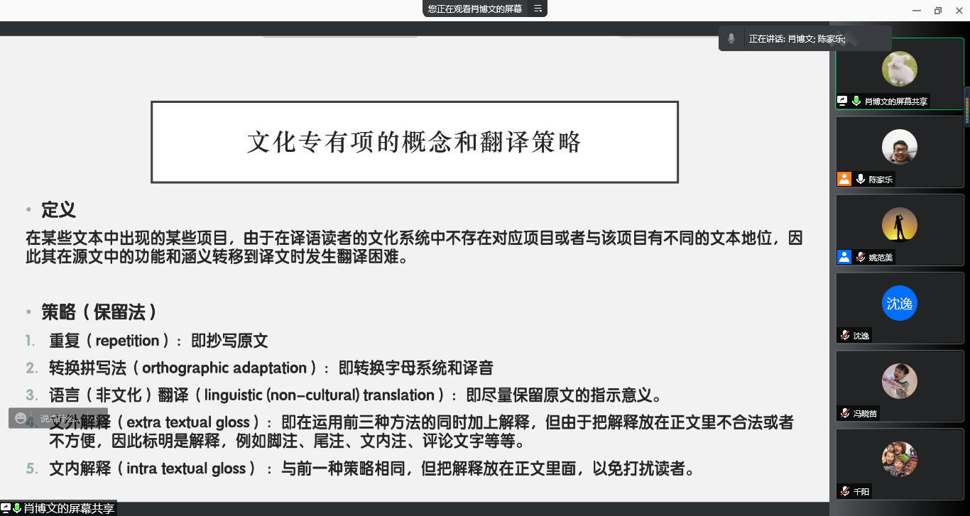 主讲人发言完毕,研究生听众提出了自己的疑问并获得解答后,姚范美老师对会议进行总结,概括了两位主讲人的主体内容,肯定了制作PPT的用苦良心。罗绮伦老师对冯晓苗同学的译例进行了点评,鼓励大家在遇到译得极好的译例时要有意识的去记下甚至背诵,也对肖博文同学的文化专有项进行补充说明,强调了中英两种文化、思维习惯的不同,从而衍生出文化专有项的现象,想追求中英两边真正的对等是理想的,但一定要坚信会有对应的表述;同时罗绮伦老师推荐大家要多读、广读文献,强调了和专业人士密切沟通的重要性。郑亚娟老师对汉绣和纺织翻译进行了背景知识补充,并和罗绮伦老师进行了深度沟通,令在座师生对纺织和汉绣专业知识产生浓厚的兴趣。
