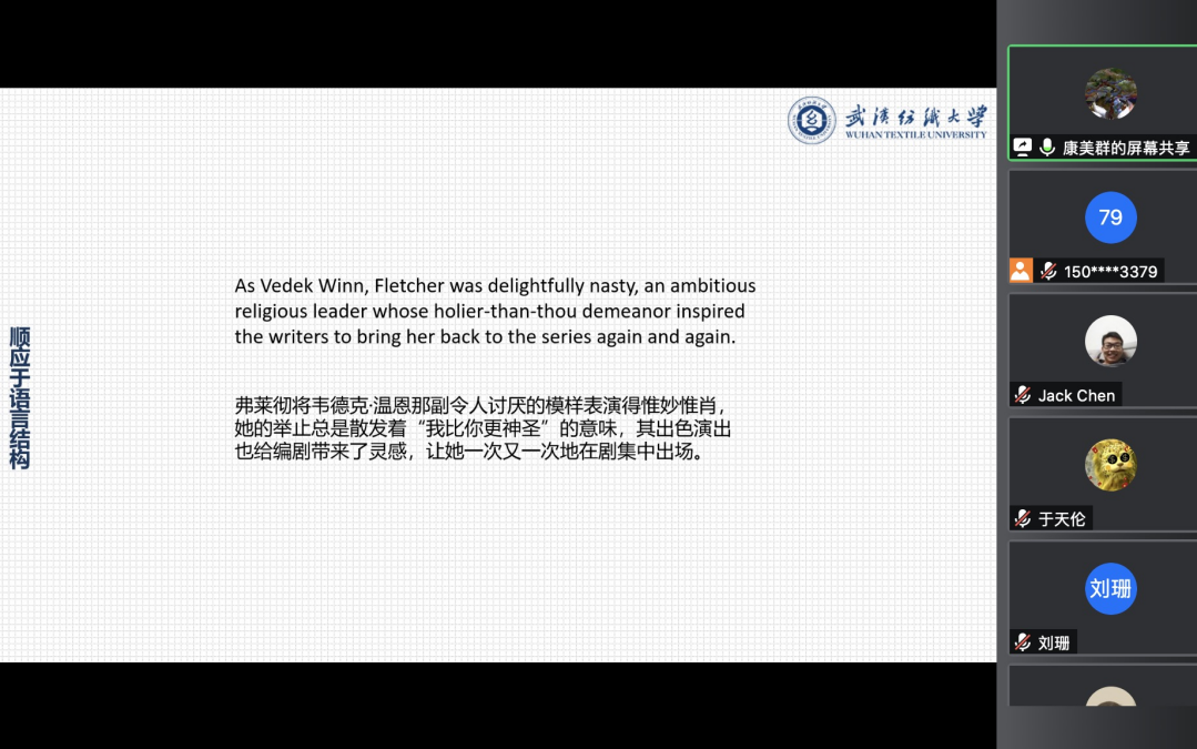 1月27日晚,武汉纺织大学外国语学院第三十六期“经纬译学”研究生论坛在线上成功举办。本次论坛由外国语学院赵伟副教授主持,20级研究生康美群和21级研究生刘梦主讲,外国语学院院长谭燕保教授、刘珊副教授、陈奇敏副教授和全体翻译硕士研究生参加了此次论坛。