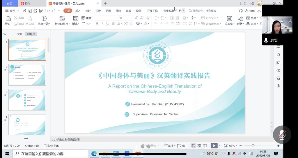 参加答辩的学生报告论文的主要内容,时间为5分钟,在答辩过程中,研究生以图文并茂的形式,结合PPT阐述自己论文的选题目的、理论框架、翻译项目的准备、翻译难点实例分析及反思。随后,答辩委员会成员分别对答辩学生提问,指出论文中存在的问题并给出建议,时长为15分钟。湖北省翻译协会会长、武汉大学刘军平教授指出此次答辩的选题彰显武汉纺织大学校本特色,同学准备充分、思路清晰,表达流畅,报告内容丰富,理论与实践紧密结合,但在格式上还需要更规范。他希望研究生认真思考评委老师的意见和建议,及时与指导老师沟通,根据实际情况进一步完善自己的论文。
