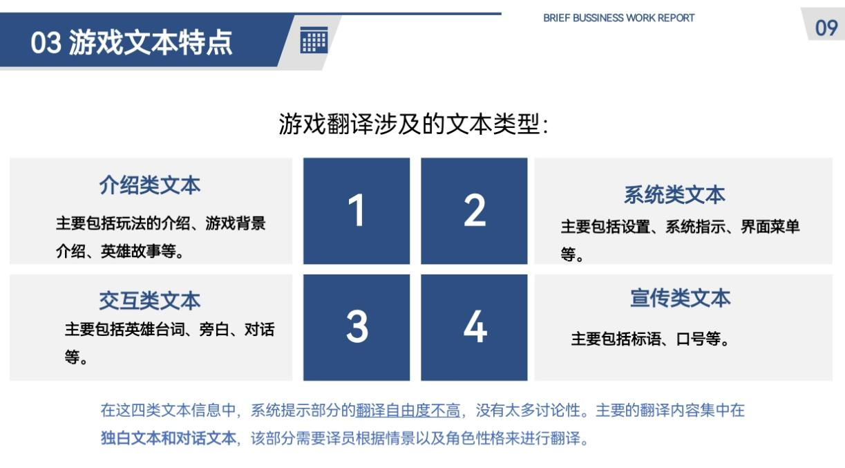 第二位汇报人呙新同学分享的主题是机辅下游戏本地化翻译研究。呙新的分析分为四个部分:计算机辅助翻译的介绍、游戏本地化的概念、游戏文本特点、案例分析及总结。她从译前准备、译中翻译到译后审校的全过程来讨论计算机辅助游戏翻译。在译前准备中,术语的提取及游戏的试玩是必不可少的,比如利用OCR屏幕识别对游戏内文本的术语进行提取。翻译过程中又需要利用各种软件将高频术语进行建库使译员不必翻译库内已有内容。译后审校环节包括初审、专家审核以及终审三次审核行为,以确保翻译符合客户要求。呙新继续讨论了游戏本地化的内容,翻译游戏需要根据用户对语言和文化的特殊要求对语言进行加工,从而激发玩家的兴趣。接着她分享了游戏文本的类型,比如介绍类、系统类、交互类以及宣传类文本,特别是交互类文本的翻译需要译员考虑情景及角色。最后,她通过分析例句讨论了翻译游戏文本的策略,比如将英文被动语态转换为中文的主动表达,调整句子语序,以及注意专业术语翻译的严谨性。