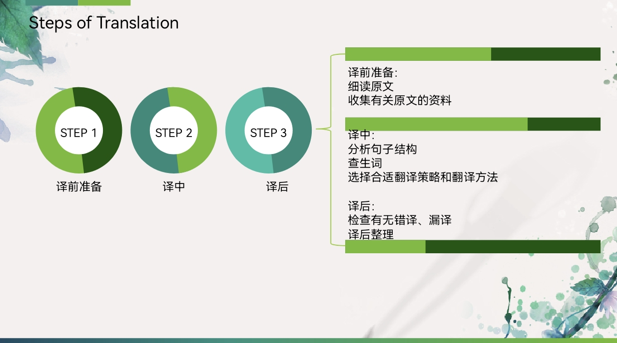 第三位汇报人吴静雯同学分享了她近期阅读并翻译的一本文学作品中的第一部分——《献给艾米丽的一朵玫瑰》。吴静雯将她的翻译过程分为三步:译前准备、译中和译后。在译前准备过程中,她细读原文,并收集了相关资料,包括作者、写作背景、作品简介等。译中,她分别从分析句子角度、查找生词、选择合适的翻译策略对文本进行了翻译。译后,检查有无错译、漏译,并最后整理译文。吴静雯这以严谨的翻译过程以及她对文学作品精读的学习态度获得了几位老师的高度表扬。此外,吴静雯还分享了她自己翻译的几个例句,通过对比自己的译文与参考译文,她总结出参考译文值得大家学习的几个地方,比如译文中多用四字词汇,英文熟词生义需要积累,翻译有时需要调整语序等,参会的同学们都表示收获满满。