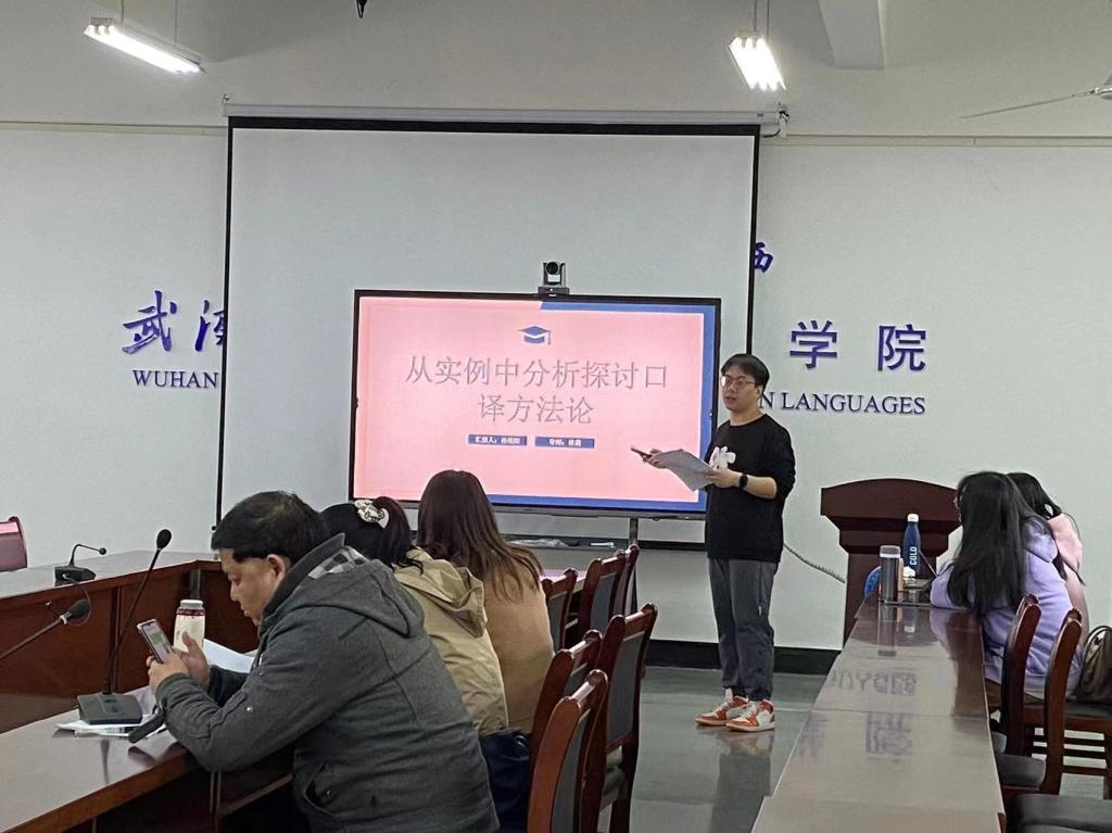 第一位汇报人孙境阳同学以释意理论为理论指导,从实际案例出发分析和探讨口译方法论。他首先向大家介绍了释意理论的的背景和内涵,简单介绍了该理论的优缺点和适应范围。然后他再从文化负载词、口语表达词、特色政经词三个大方面,结合直译、意译、简译、整译等翻译技巧具体分析案例中的英文翻译,并进行讲解。
