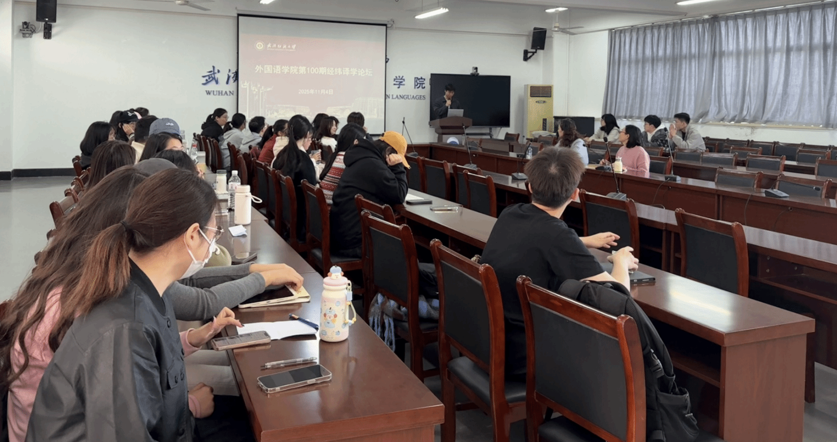 11月4日,外国语学院第100期“经纬译学”论坛在04-303教室成功举办。副院长刘方荣与MTI教育中心副主任陆雪芹应邀分别担任本次论坛的特邀点评嘉宾及教师主持,24级研究生金国丰担任学生主持,24级研究生卢嘉怡、邹航以及25级研究生彭雅晴、罗梦凡在论坛上进行了分享。