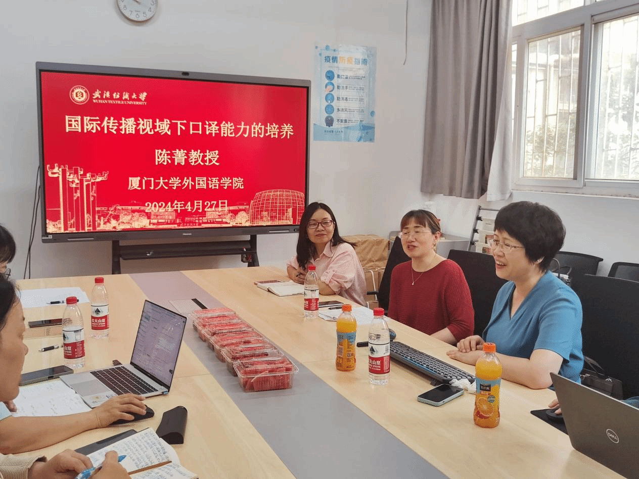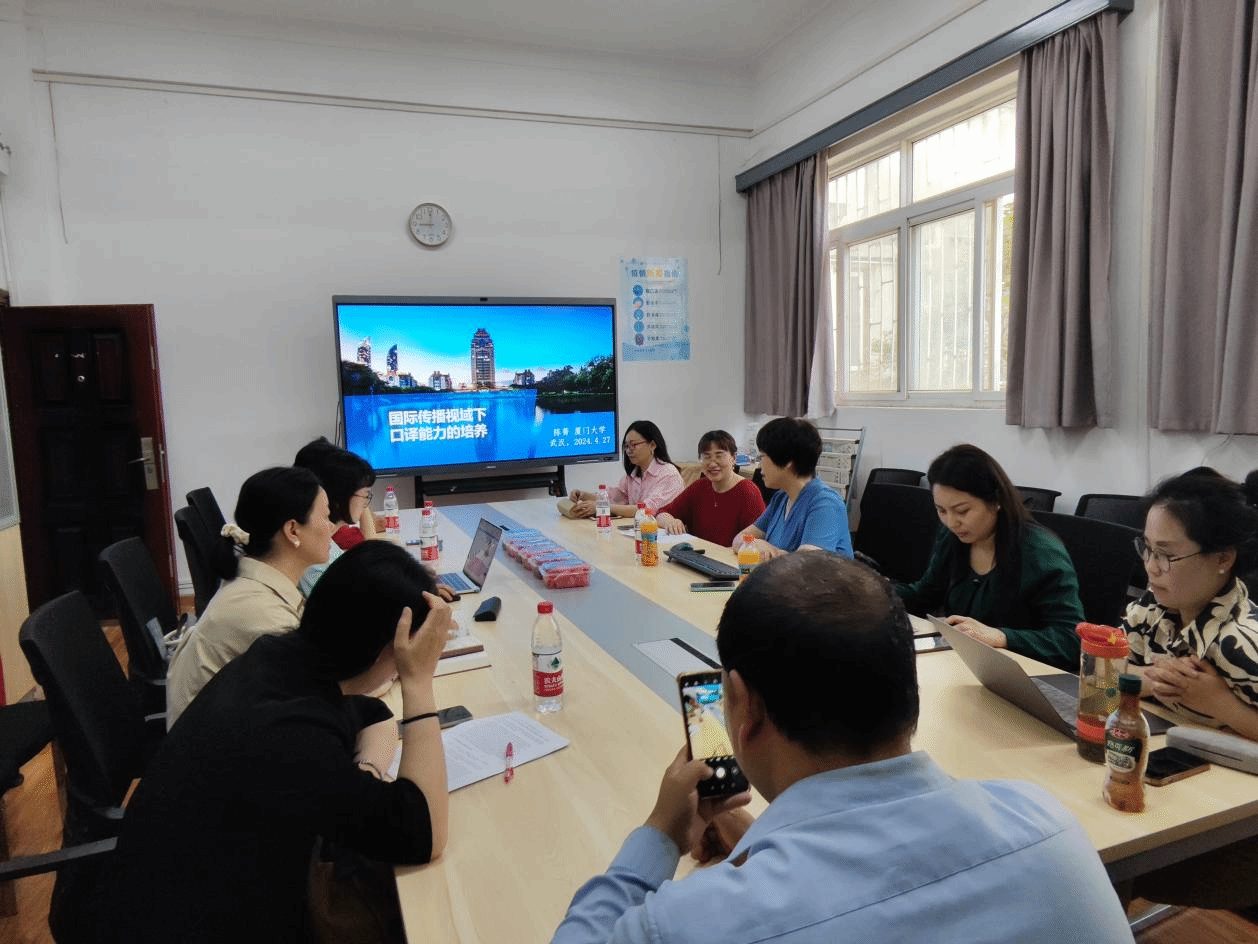 4月27日上午,厦门大学外文学院院长陈菁教授受邀在我校做了题为“国际传播视域下口译能力的培养”的学术讲座。讲座由外国语学院院长谭燕保教授主持,副院长刘方荣、外国语学院全体硕士生导师及MTI任课教师参加聆听。