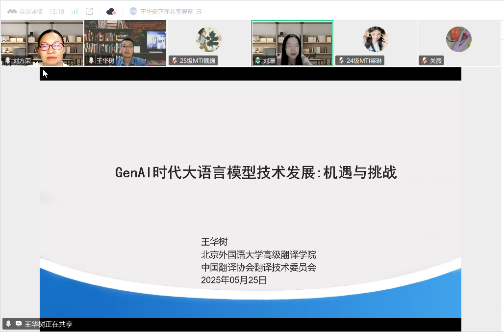 5月25日晚,武汉纺织大学第817期阳光论坛暨外国语学院第69期崇文讲堂在线上成功举办。本次论坛特邀北京外国语大学人工智能与语言教育研究中心王华树教授作题为"GenAI时代大语言模型技术发展:机遇与挑战"的学术讲座,讲座由MTI教育中心主任、“人工智能赋能翻译技术”教学团队负责人刘珊主持。