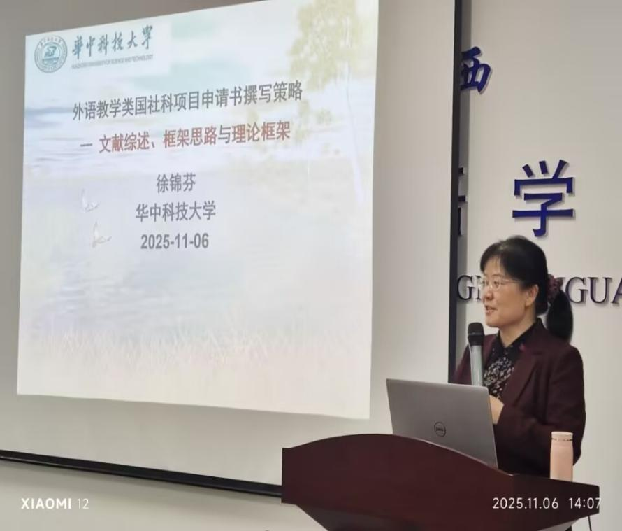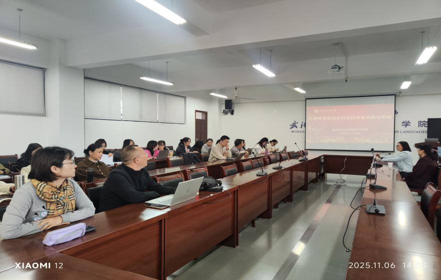 11月6日下午,华中科技大学徐锦芬教授应邀来外国语学院做国家社科基金项目申报书撰写指导。讲座由副院长刘方荣主持,学院的教授,副教授,博士及青年教师现场聆听了讲座。
