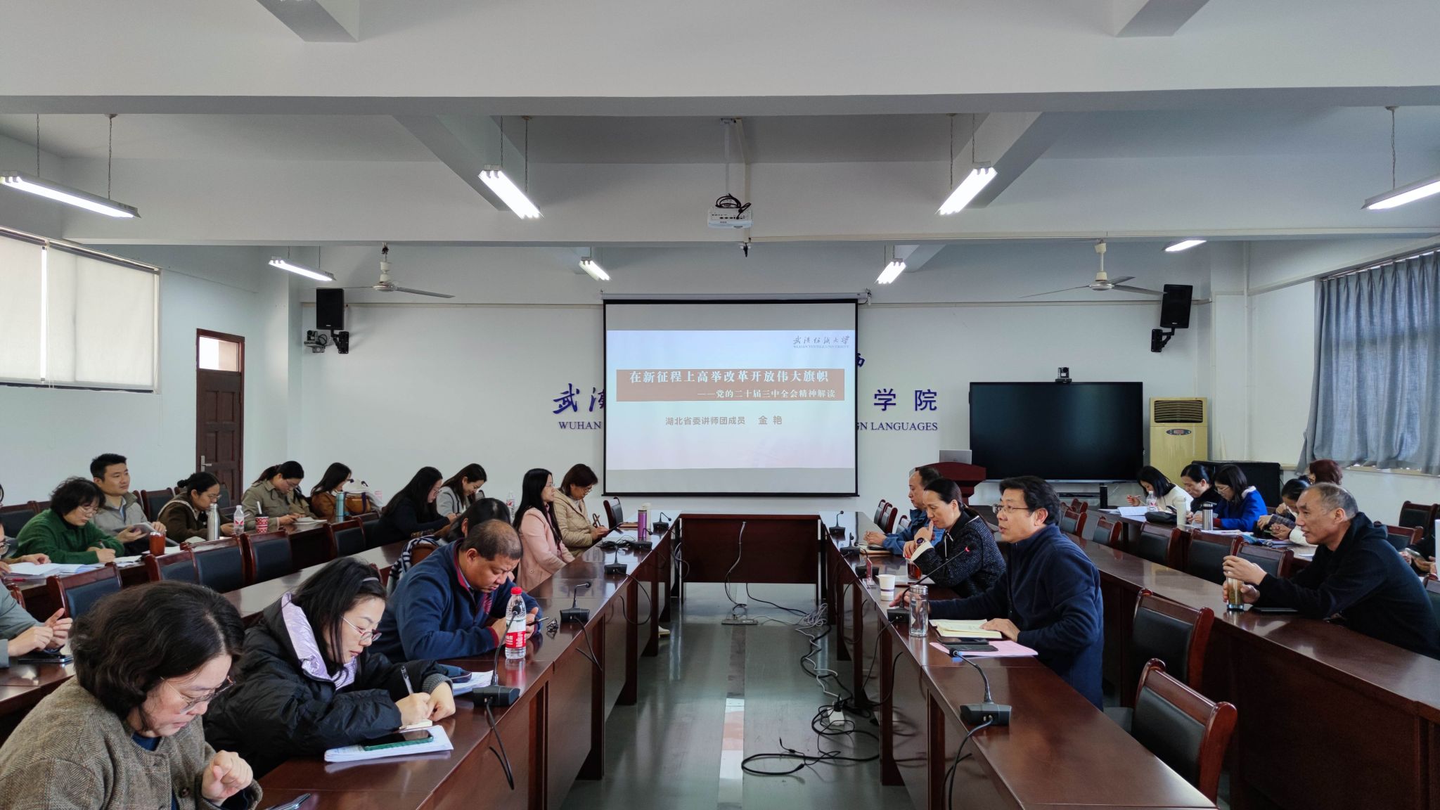 11月21日下午,外国语学院在崇文楼04-303会议室举行学习贯彻党的二十届三中全会精神宣讲会,校党委常委、组织部部长金艳作专题辅导报告,学院全体教师党员参加会议。学院党委书记胡中原主持会议。
