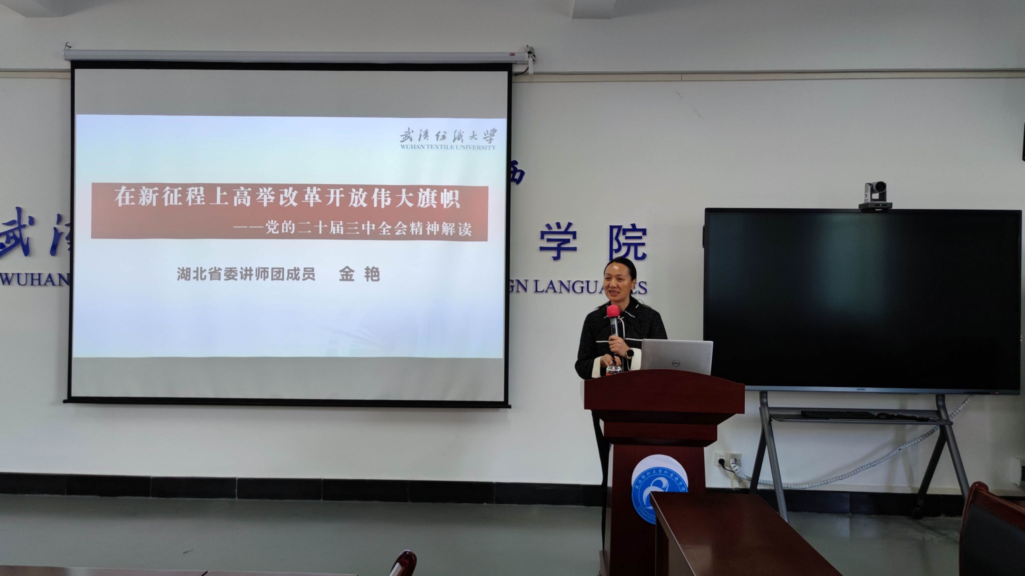 金艳以《在新征程上高举改革开放伟大旗帜》为主题,从全会精神的结构概况、深入把握全会精神的重点内容和贯彻落实全会精神的基本要求三个维度,对全会精神进行了全面、细致且深入的阐释。结合学校和外语学院实际,她指出,外语学院要发挥专业优势,积极搭建国际交流平台,致力于提升国际传播的影响力,构建具有中国特色的话语体系和叙事体系,传播中华优秀传统文化,生动讲述中国故事。