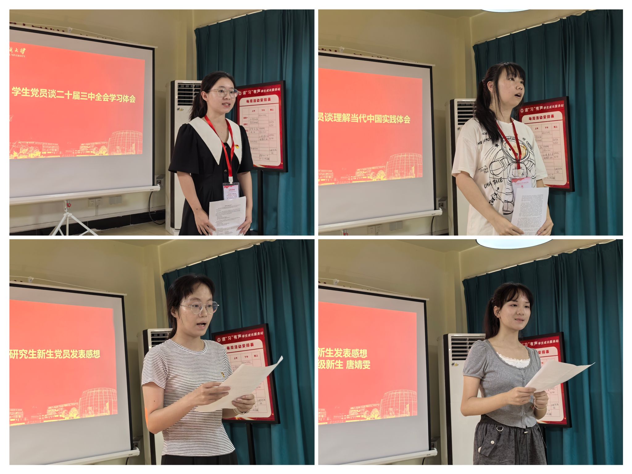 中共党员代表、英语12101班宋美琪分享道:“党的二十届三中全会的召开,让我们再一次深刻感知改革开放的磅礴之力,身为青年学生党员,我会将全会精神融入日常,矢志不渝面向世界,讲好中国故事、弘扬中国精神、传递中国价值!”预备党员代表、英语12201班余欣桐谈道:“今年暑假,我在院长谭燕保教授的带领下参加了红安大布织就红色基因图谱社会实践,体会到了红军与百姓间生死相依的真切情感、体会到了投身于革命事业的先烈的勇敢和坚毅,更让我明白,讲好中国故事、传递中国声音,是外语学子们义不容辞的责任。”