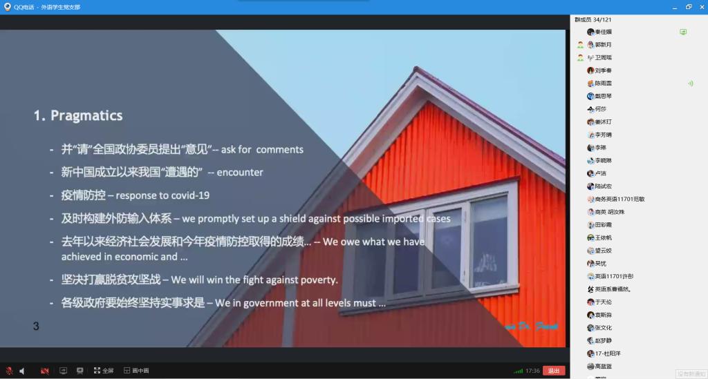 本次会议的特殊环节还邀请到学院英语系党支部教师党员曹福然老师为同学们进行主题为“小词大意”的讲座,曹福然老师通过2020年政府工作报告英文翻译为例从多个方面举例给同学们解释,传授专有名词和政府公文翻译的新知识。即便是隔着屏幕,相距千里,曹老师的课程演讲与教学质量也让全体党员同学们深觉受益匪浅,意犹未尽。最后,曹老师以“一口流利外国语,一颗赤诚中国心”勉励所有学生党员同志们,并结束演讲。