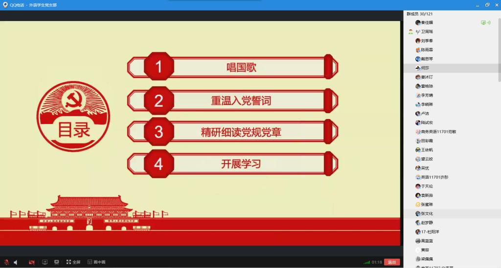 本次会议分为四个环节。主持人秦佳媚同学带领各位党员一起演唱国歌并重温入党誓词;这一环节结束,于天伦同学随即带领各位同志学习新的党规党章,使同学们进一步了解党的地区委员会的工作任务和职能。