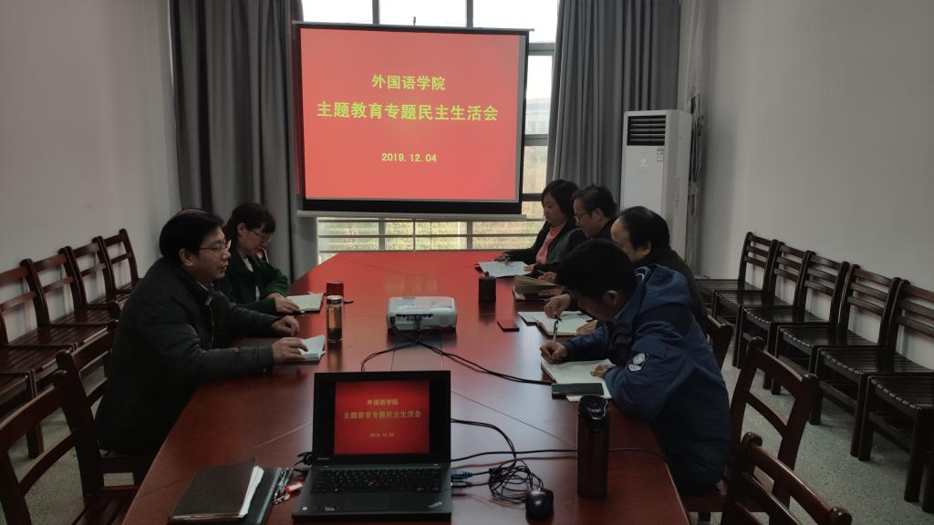 12月4日下午,外国语学院在崇文楼313会议室召开2019年领导班子“不忘初心、牢记使命”主题教育专题民主生活会。学院党委书记胡中原、副书记王芳、副院长罗绮伦参加会议,学院院长谭燕保、副院长柯群胜列席会议。民主生活会由胡中原书记主持。