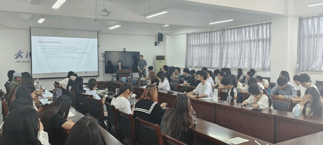 5月6日下午,世界著名科学家来鄂讲学计划专家、美国爱达荷州立大学的语言学家Prof. Brent Wolter在崇文楼为外国语学院师生作题为“Second language vocabulary acquisition: A beginning without an end?”的学术讲座。外国语学院副院长刘方荣、商务英语系主任吴志杰和英语及商务英语专业23级全体学生参加并聆听了本场讲座。讲座由商英12301班司嘉琪同学主持。