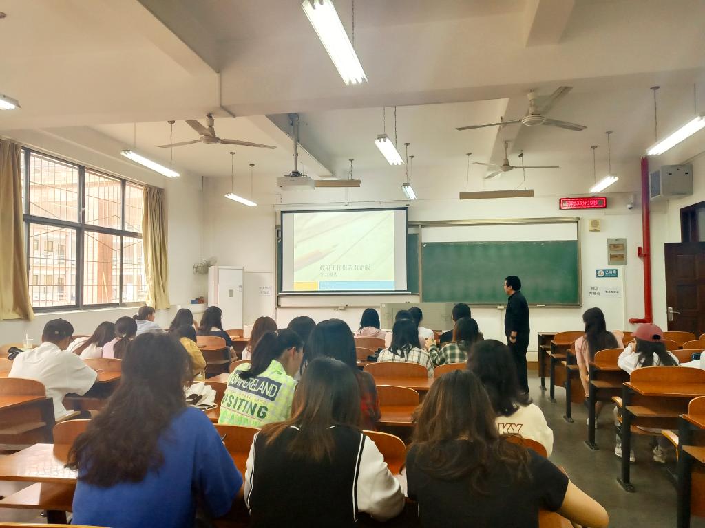 为深入贯彻实施两会精神,根据上级相关要求和校党委组织部通知精神,结合学院有关工作安排,外国语学院英语学生党支部于2021年5月20日在三教108教室开展双语特色支部主题党日活动。本次邀请到了学院大英第一党支部党员曾令宙老师,带领学生党员们学习政府工作报告双语版。