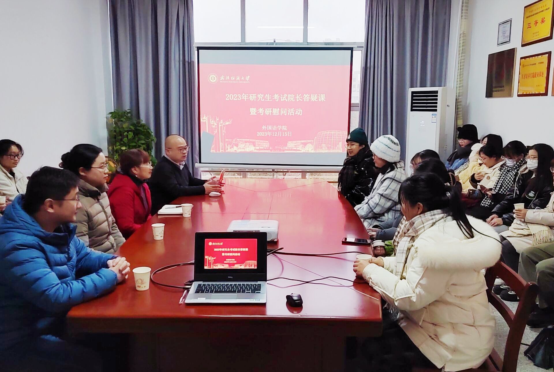 12月15日,外国语学院举行研究生考试“院长答疑课”暨考研送温暖慰问活动。院长谭燕保教授为20级正在备考研究生考试的同学们答疑解惑,并送上考研前的慰问。学院学生工作负责人、青年博士、办公室主任、毕业班辅导员参加相关活动。