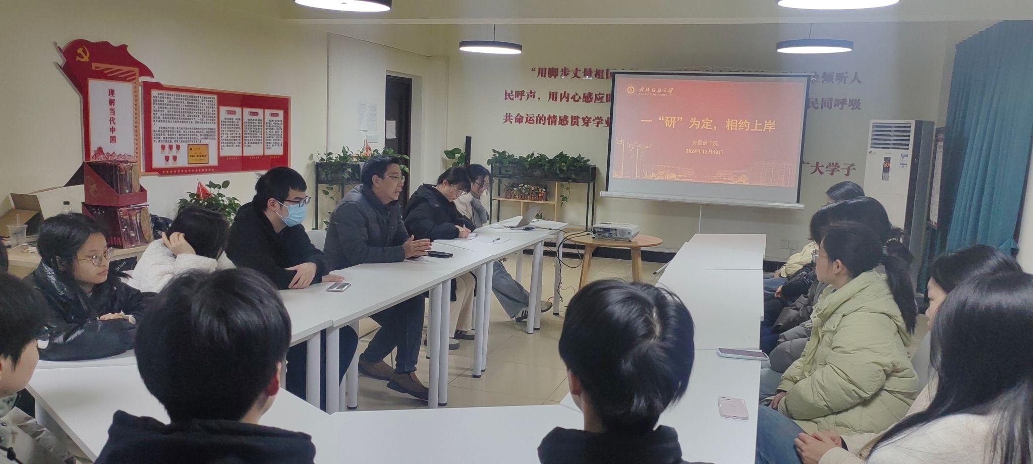2024年12月12日,为鼓舞士气,传递关怀,外国语学院党委书记胡中原深入读“习”有声一站式学生社区,为即将踏上考场的考研学子们送去温暖与鼓励,辅导员甘新敏及2021级考研学生参与会议。