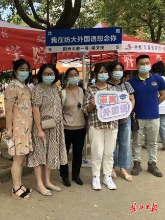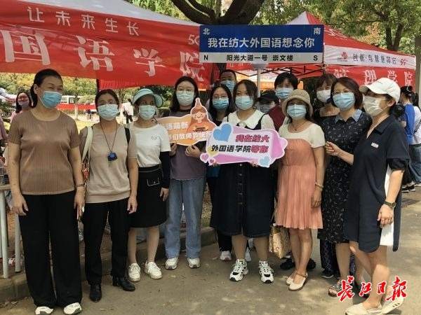武汉纺织大学外国语学院部分老师学生在迎新处。 记者胡义华 摄