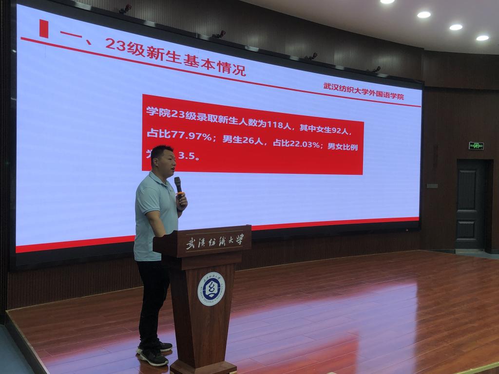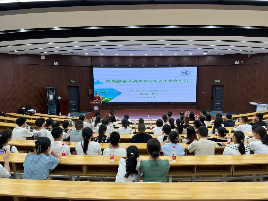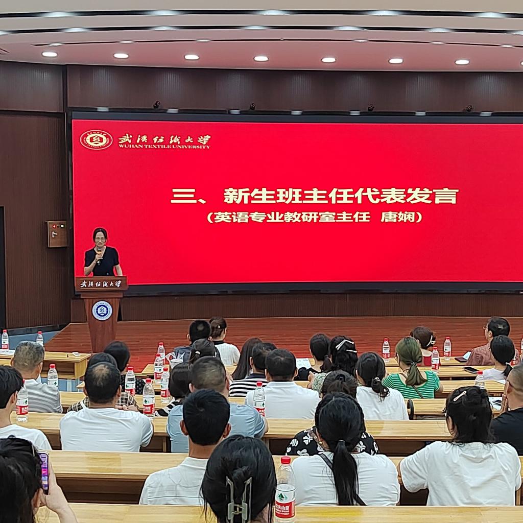 院长谭燕保教授对2023级新生加入外语学院大家庭表示欢迎,以“跨界融通,英语类复合型人才大有可为”为主题致辞。谭燕保从英语类专业是干什么的?武汉纺织大学外国语怎么样?我们如何一起成就孩子?三个方面对学科专业以及家校协同进行了具体说明。详细介绍了学院学科设置、师资队伍团队、第二课堂、英语类专业的培养目标以及教育教学软硬件资源,展示了学院历年取得的成就与荣誉,讲述了学院优秀学子典型案例,让新生同学和家长更加深入了解学院和英语类专业,并鼓励同学们信任自己的专业、持续努力,成为一个有颜、有才、有趣、有用的人。谭燕保鼓励家长们积极参与家校共育,接受同学们成长的节奏,向同学们传递责任,多关注同学们身心状态,做同学们的知心朋友。