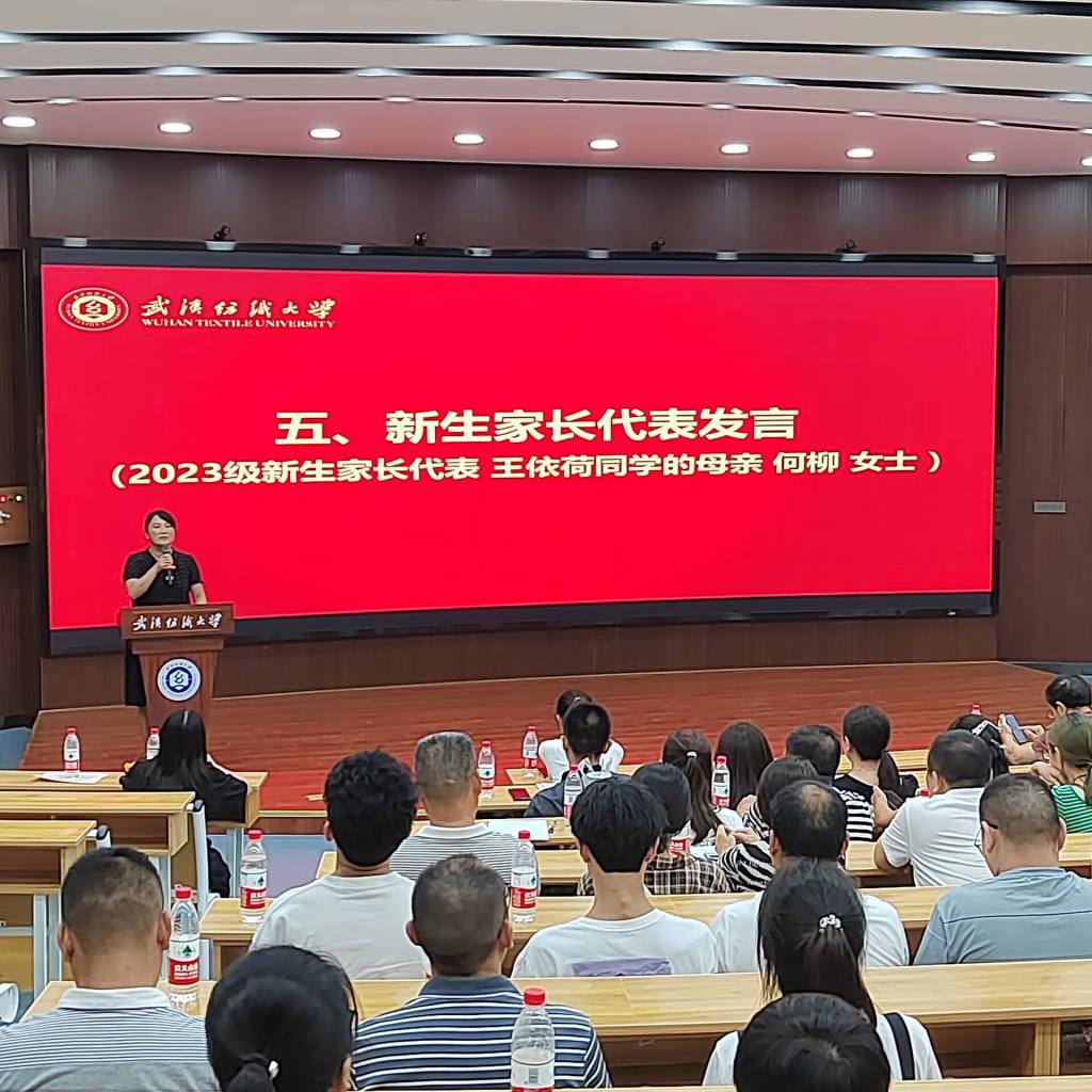 英语专业王依荷的母亲何柳女士作为新生家长代表发言。她表示,将孩子送到纺大,一是鼓励家长朋友们做到放手、放心但不放任。鼓励家长相信孩子、相信学校、相信老师,做孩子的知心朋友。二是鼓励孩子们要爱学校、尊老师、礼同学、严律己,认清大学是起点,不是终点,鼓励孩子们在大学里培养独立思考、独立生活、独立处事的能力。三是希望学校加强学生的引导和教育,为同学们营造浓厚的学习氛围,充分运用各类学习资源,为孩子们提供更好的学习平台,提供更优质的实习实践机会,培养更多拥有世界眼光、家国情怀、敢于担当的新时代青年。