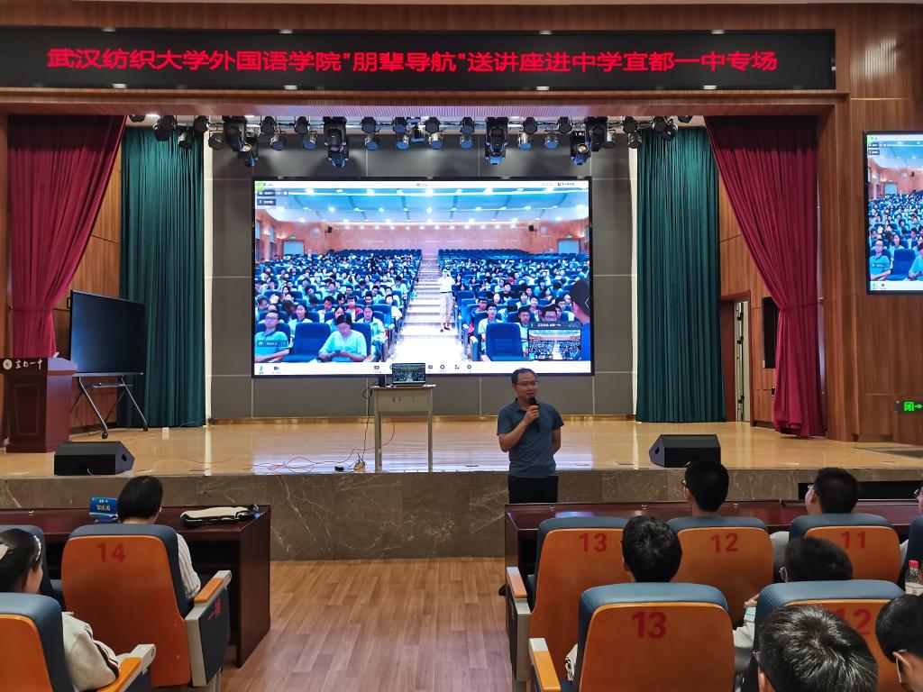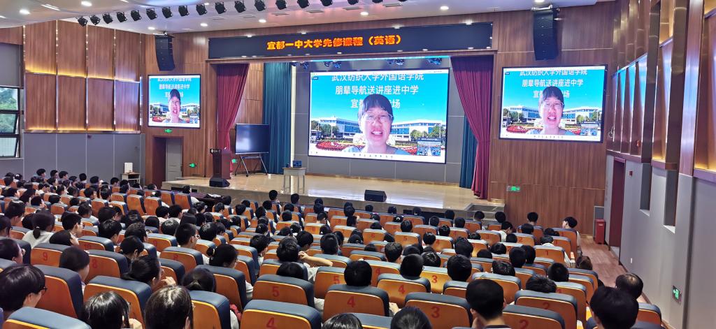 “听说月面国旗就是纺大制作的……”、“我前几天还在视频上看到纺大校长了……”宜都一中礼堂内氛围隆重且热烈。6月1日下午,外国语学院联系生源地学校宜都一中,通过线上平台开展“朋辈导航——送讲座进中学”招生宣传活动,宜都市第一中学副校长邹庆禹、外国语学院院长谭燕保、副院长刘方荣、副书记彭阳慈航、MTI中心主任刘珊、辅导员聂啸天参与宣传活动。2020级研究生顿新琪、2018级本科生刘心依燃作为主讲人,宜都一中300多名师生一同全程观看讲座。