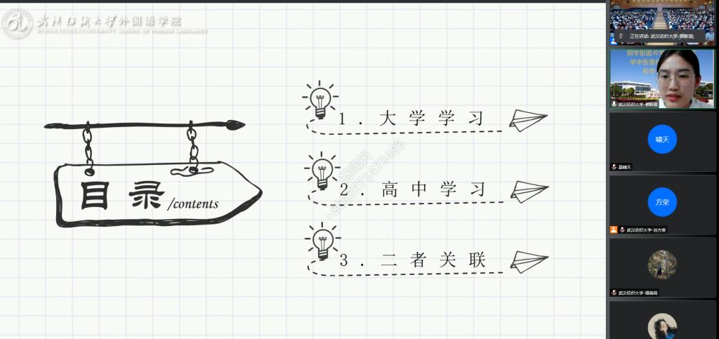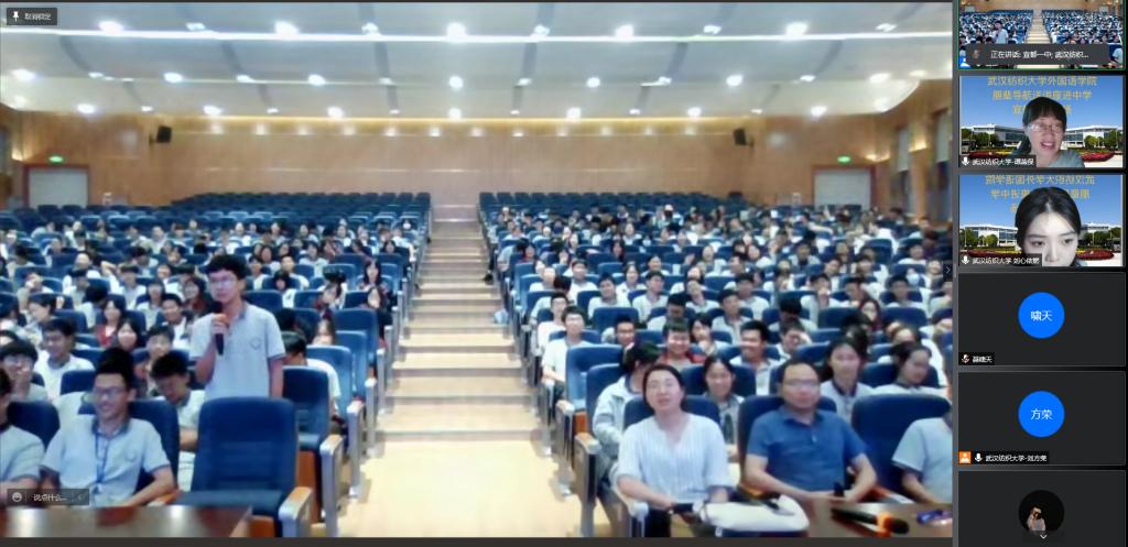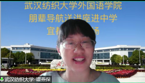 最后,线上讲座在师生热烈的互动中圆满结束,宜都市第一中学副校长邹庆禹通过视频向学院精心准备的精彩讲座表达了感谢,他表示武汉纺织大学学术实力强、人才培养质量高、拥有良好的社会声誉,是宜都一中重点合作的高校之一,在纺大的宜都学子都收获了精彩的人生,希望与纺大外国语学院建立长期的合作互访关系,进一步增进相互交流提高人才培养质量。